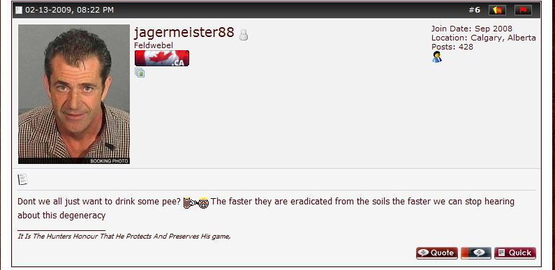There is but one Race, and that race is human. All that fucking nonsense about racial pride can be shoved right back up their Aryan Ass holes where it came from. What upsets me most Is how this affects the youth, no child should fear walking the streets cause some blood thirsty,genocidal psychopaths decided they don't deserve to be here. It doesn't matter weather your The European Canadians, Asian Canadians, The African Canadians, Canadians that Moved here from Sedan, Or Iraq, Or any other country for that matter, you have the right to live knowing that you are safe from such vile stupidities as national socialism. Me? I say i Am Canadian, and the color of your skin doesn't determine that, The White Supremacist says "But they are immigrants! They Don't Belong in OUR country." and I Say, Pick up a fucking history book this nation was founded on immigrants. "But The Jews.." Stop right there i don't want to hear it. So in Closing here's some friendly advise to all the white nationalist reading this: Follow Your Leader. Its Cheap and you can still be paying homage to that brilliant white master of yours who could not even uphold his own beliefs. You know, That whole "dying with honor" thing you guys all push so strongly that he couldn't live up to? yeah that.