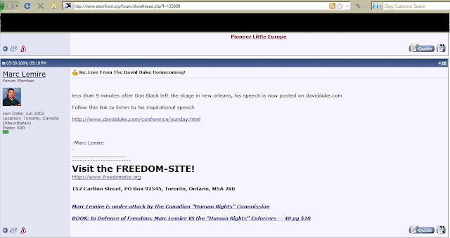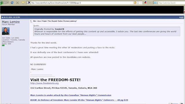 Now, the Fourniers seem to be claiming that as Mr. Lemire was found to have violated only a single count of section 13 of the Canadian Human Rights Act (publishing an article on his website which he himself didn't write) after a 6 year investigation is proof enough that he isn't a bigot and that his only crime is having stood up to Mr. Warman. They claim that he has been maligned and smeared by the taint of, "racist." Be sure that to accuse someone of racism is a very serious charge and not one we take lightly. And, as we've said, it's a loaded term that tends to stifle discussion. Rather we'll examine if some of the views that Mr. Lemire has indicated over the years could be described as bigotted. We will post the information provided by Mr. Lemire himself and allow our readers to draw their own conclusions with minimal editorial input.