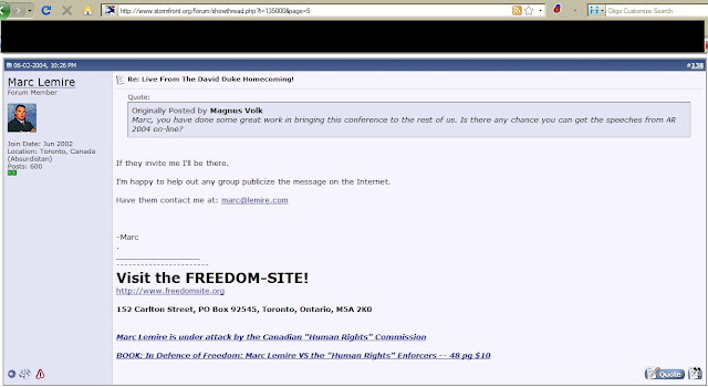 As of October 5, Marc Lemire had posted on Stormfront 600 times between June 12, 2002 and September 2, 2009. Not prolific by any stretch of the imagination, but it could hardly be attributed to a whim.