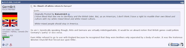 Now aside from the inaccurate views on our relative economic positions and living arrangements, (we are members of a vigorous quilting bee, bird watching society and some of us had at least one date with a real member of the opposite sex and not with a World of Warcraft avatar.... we're looking at you Sparky!) we think GermBrit has a valid point here. Perhaps we should focus more on individuals more worthy of inclusion on these pages? Such as, oh, we don't know.... members of the Canadian Navy who post on Stormfront?