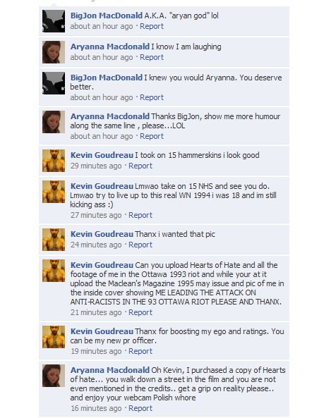 Interestingly, it looks like another bonehead may also be out of jail, or he's given someone else access to his Facebook account. In discussing the "White Pride" march that had been planned for next month (though we had doubts whether they would be able to pull it off given the current troubles of both the Aryan Guard and W.E.B.), John Marleau, or someone on Marleau's Facebook account, posted the following brief message: