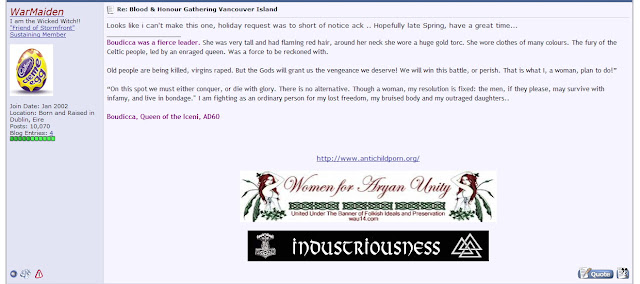 While we're interested in a number of these individuals, Vicky Cahill is of particular interest. Vicky is an Irish national currently living in the United States and who frequently visits the Blood and Honour crew in BC. On Stormfront, she posts as "WarMaiden" and was one of the people who commented on Reitmeier's picture with the South Asian woman (she was the one who originated the thread).