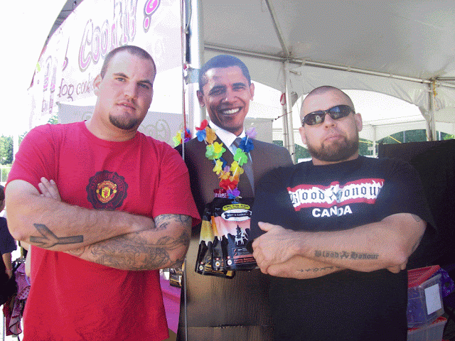 A few people of note in the picture above of Blood and Honour members and supporters include the D.A., (whom we've lovingly referred to in the past as scum and who's antics on the Aryan Guard forum were of great enjoyment to us), Shawn MacDonald, Jan (who might actually be considered an early Aryan Guard founder who has a hate on for the organization he was once a member of, albeit briefly), Rob De Chazel and Victoria ("Vicki") Cahill of Women for Aryan Unity (more on her soon).