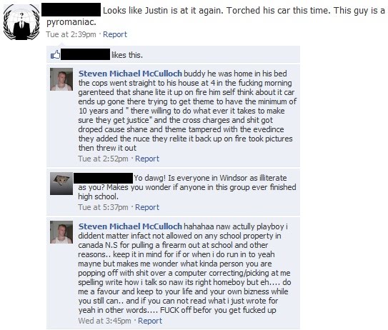 And within hours of the news that the couple’s car had been torched, what does Justin Rehberg do? Why, he does what any person facing serious charges for hate-related arson would do – he joins a Facebook group created by a mysterious “John Smith” that instructs the couple to “STFU” and includes the taunting description, “Adding fuel to the fire”:
