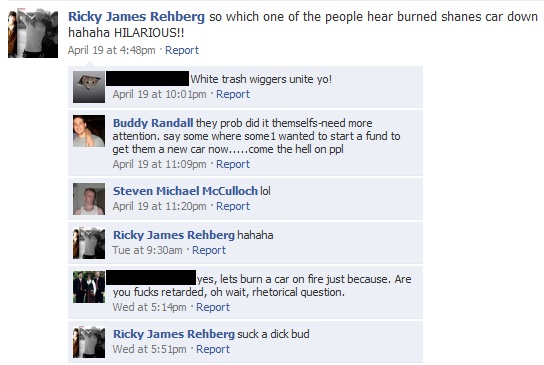 So much for regret, remorse, or taking responsibility. Not that we assumed Justin Rehberg was capable of any of those things, but we did have hope, for the Howe-Lyon family’s sake. It’s extremely unfortunate that an interracial couple is being driven out of their own home while the violent morons who actually should be leaving the community continue to gleefully spew bile on the internet: