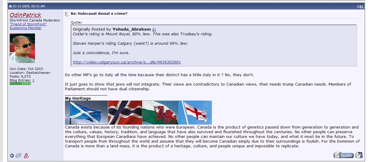 OdinPatrick (who also appears to post on Free Dominion as "Padraigh" and is one of the individuals named in the Warman defamation suit), is Dan Martin from Nanaimo, B.C. He is the senior Canadian moderator on Stormfront (a well-known hate site) begun by former Grand Wizard of the Ku Klux Klan, Don Black.