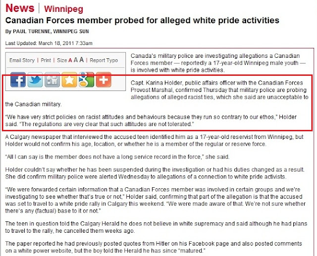 Here IS the pathetic, wimpy  statement fittingly made by an unnamed spokesWoman for the Military Police: "Pride in being White is 'contrary to our ethos,' that 'such attitudes will not be tolerated' and could lead to administrative or disciplinary action, including a dishonorable discharge from the military." (Winnipeg Sun, March 18, 2011)