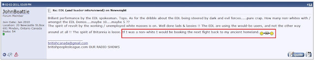 This would be bad enough, but Beattie has also repeatedly supported the use of violence to remove, "non-Whites" from North American and Europe and is a staunch supporter of the EDL (when others have criticized the EDL for allowing a few non-Whites and Jews into the group, Beattie jumps to their defence and claims that the EDL is, "using the users):