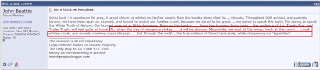 We've mentioned William John Beattie a few times on these pages as he occasionally posts on Stormfront. To give our readers a bit of an idea about Beattie, here is one of his more recent posts: