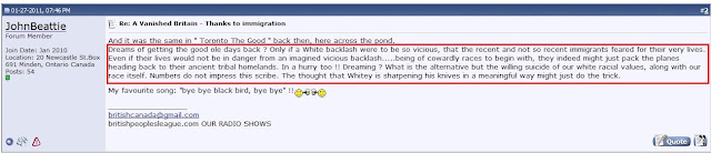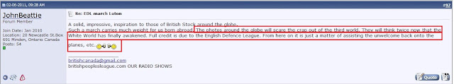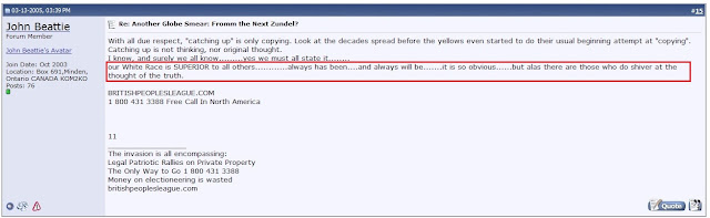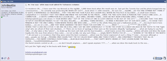 Mr. Beattie will forgive us if we don't take his claims regarding the peaceful nature of himself and what few members of the British Peoples League who may exist all that seriously in light of these particular examples (and there were more that we could have posted).
