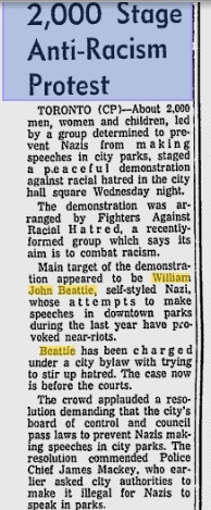 What continues to intrigue us is that the old guard of the Canadian bonehead movement are still around and still trying to be relevant. In some ways it is instructive for contemporary activists, as the methods and language used by the boneheads really haven't changed much in 50 years. The following are some of the articles that we were able to find concerning Beattie (all are in order between 1965 and 1970). In many of them, all one has to do is replace, "Beattie" with "McKee", "Canadian Nazi Party" with "Aryan Guard", and "John Ross Taylor" with "Paul Fromm" and one would be hard pressed to distinguish between the events of the 60s and what is happening today: