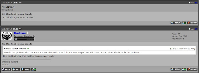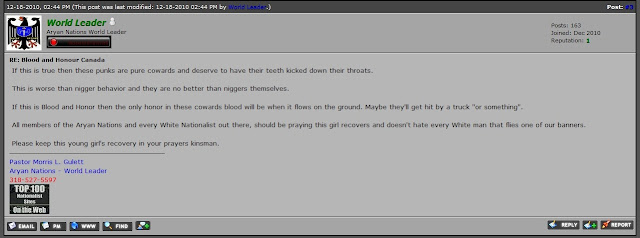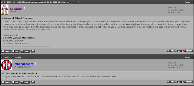 Back in 2008, Waters and three Klan members visited Regina for the, "White Pride" march organized by the Aryan Guard. Since then, there has been a falling out between the Waters' Klan and the Aryan Guard (WN disunity? We are shocked AND appalled!) but the relationship between Waters and WEB has remained close. As recently as a few months ago, Waters was slamming the Aryan Guard/Blood & Honour/etc/etc/etc, and using us as their source material to do so: