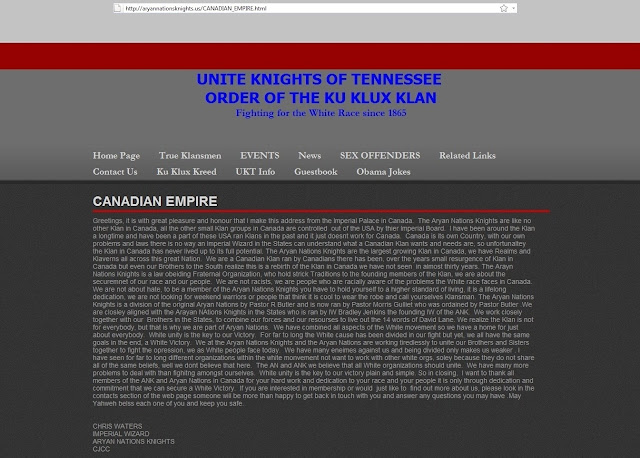 Well that's the funny thing. Chris Waters (the XXXXXXXL fella on the left..... we wonder if he is able to buy his Klan sheets of the rack or if they need to be specially tailored for him?), who was once the Grand Dragon of the BOK in Canada (damn, these acronyms are becoming tiresome) has left that Klan movement and is now the Imperial Wizard of the ANK in Canada.