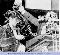 Attorney for the Chicago 7 William Kunstler was assaulted and slightly injured during a speech  in Toronto after members of the Edmund Burke Society stormed the stage. Prior to the assault the Burkers had been heckling Kunstler so a spokesperson was invited to state the groups views. Paul Fromm took the stage and poured water over Kunstler’s notes, resulting in Kunstler pouring water over Fromm.