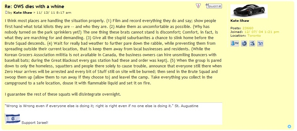 Kate Shaw: I think most places are handling the situation properly. (1) Film and record everything they do and say; show people first hand what total idiots they are -- and who they are. (2) Make them as uncomfortable as possible. (Why has nobody turned on the park sprinklers yet?) The one thing these brats cannot stand is discomfort; Comfort, in fact, is what they are marching for and demanding. (3) Give all the stupid suburbanites a chance to slink home before the Brute Squad descends. (4) Wait for really bad weather to further pare down the rabble, while preventing them from spreading outside their current location, that is keep them away from local businesses and residents. (While the Korean Grocers Association militia is not available in Canada, the business owners can hire unsmiling Bouncers with baseball bats; during the Great Blackout every gas station had these and order was kept). (5) When the group is pared down to only the homeless, squatters and people there solely to cause trouble, announce that everyone still there when Zero Hour arrives will be arrested and every bit of Stuff still on site will be burned; then send in the Brute Squad and swoop them up (allow them to run away if they choose to) and leavel the camp. Take everything you collect in the campground to a safe location, douse it with flammable liquid and set it on fire.
