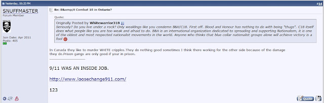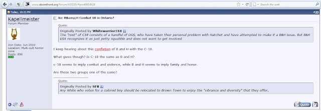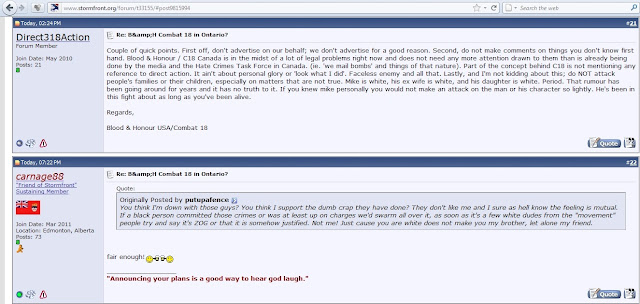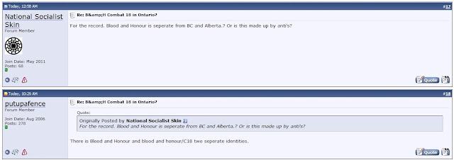 Well, to be fair, that wasn't Blood & Honour/C18 implicated in the murder of a disabled man. It's actually Rob Reitmeier and Tyler Sturrup of W.E.B., the latter being the target of an attempted pipe bombing allegedly by the Kyle McKee (who also spoke up recently in favor of the use of violence) the leader of Blood & Honour/C18 in Calgary. Perhaps that's splitting hair though.