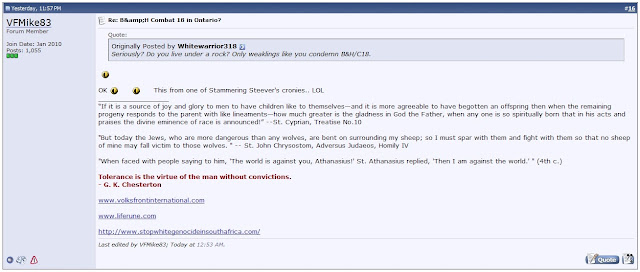 Alright, a quick comment. "Whitewarrior318" is about to claim that, "Blood & Honour has nothing to do with being a thug" though he does say that Combat 18 does what needs to be done. Keep this in mind as you continue reading.