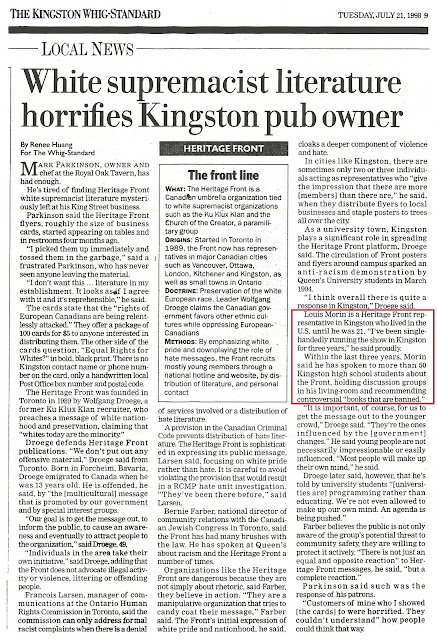 This article, published in July 1998, indicates the Heritage Front, though dissipated, still existed 4 years after it is claimed to have been finished. And it existed without the presence of Grant Bristow. Also regarding this 1998 newspaper article, note that we will be dealing with Louis Morin and his relationship with Lemire in more detail in another part of this series.