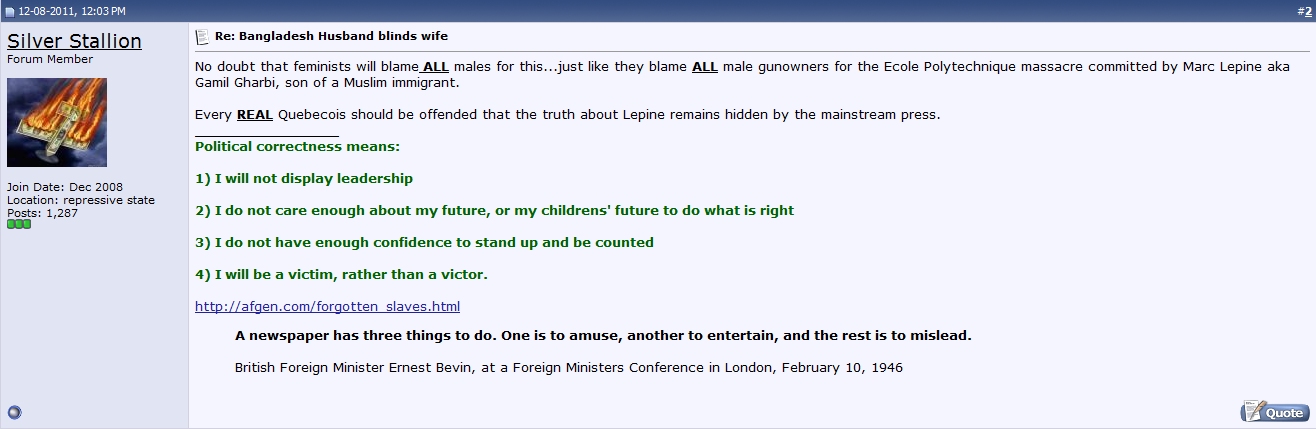 Marc Lepine’s father was an Algerian, non-practising Muslim who left his family when Lepine was seven. His father was a misogynist and an abuser, and his son hated him so much that when he was 14 he legally changed his name from Gamil Gharbi to Marc Lepine, taking his mother’s surname. He was raised by his mother, a former Catholic nun who later rejected religion. Lepine was baptized a Catholic as a baby but was described by his mother as a “life-long atheist.” Despite his half-Algerian background, as a teenager he admired Adolf Hitler. Trying to blame Islam for Lepine’s actions makes little sense because his father himself rejected the practice of Islam. It would make about as much sense to blame the murders on Catholicism because his mother, who raised him during much of his formative years, was once a Catholic. That matters little to those equally invested in spreading racism and Islamophobia and in undermining the women’s movement. In recent years, Lepine’s half-Algerian origins are something that has united extremists across varying backgrounds – from the kooks at JDL and CHA, to the “principled conservatives” at Free Dominion, to the white supremacists on Stormfront: