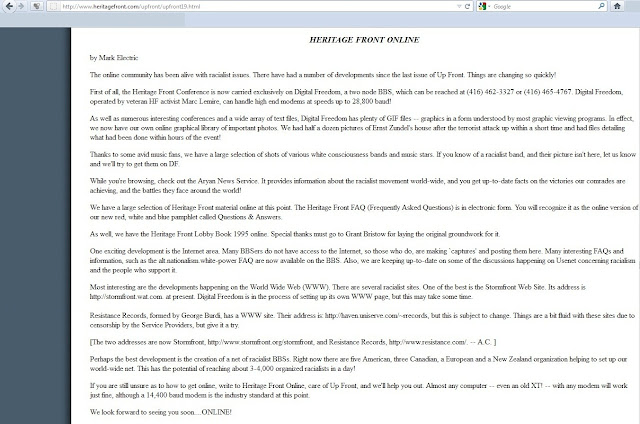 We're hoping to find an actual paper copy that we could scan and post later, but what we have here is the September 1995 (Volume 18) edition of, "UpFront." This was, for a long time, the Heritage Front's mouthpiece before the advent of the Internet, however in this particular edition we see the Heritage Front embracing the new technology as a means of disseminating information (this edition of the magazine was subsequently included on the Heritage Front website):