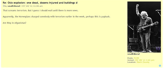 Now when we posted the article in question, it wasn't intended to claim that the folks on Free Dominion agreed with or justified Breivik's actions (though, again, we invite our readers to examine Ed Kennedy's posts in the years and months prior to when the tragedy took place) but to comment on their tendency to jump to conclusions that fit their ideological bent. Certainly we're all capable of doing this and that reality doesn't know political ideology, however Free Dominion members have a tendency to pat themselves on the back about how they would never do that themselves. Some of our friends made that point clear much earlier than we did (see here and here).