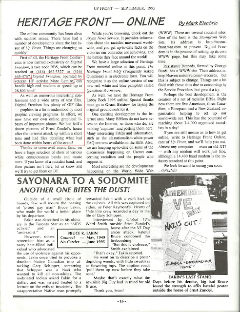 We had actually thought this was the earliest reference to Lemire as being a member of the Heritage Front, however he was also mentioned in the April 1995 edition of "UpFront" as well, Under the heading, "Racialism and the Electronic Highway":