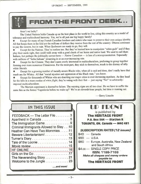 Not long ago we received a parcel containing copies of "The HF Report" which was the Heritage Front journal that existed after "UpFront" was discontinued; the publication of "The HF Report" took place between 1997 and 1999. However, we should have looked closer, as we also found a copy of "UpFront" which we have already mentioned here on this blog in relation to our documentation of Marc Lemire's Heritage Front connection: