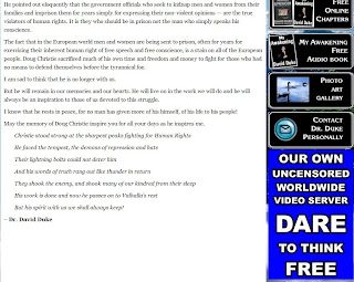 Not surprisingly, we've already been criticized for our focus on Doug Christie by our friends at Free Dominion, including what might be a veiled (and pretty ironic in light of their claim to be supporters of free speech) threat of, we suspect, future litigation for having the temerity to post and comment on what Christie himself published. But then this is all part of the whitewash of Doug Christie and his reinvention as a free speech hero who defended those who said or wrote quirky things about Jews and people of color. As a result, Christie has practically been deified while we and other Christie critics are vilified.