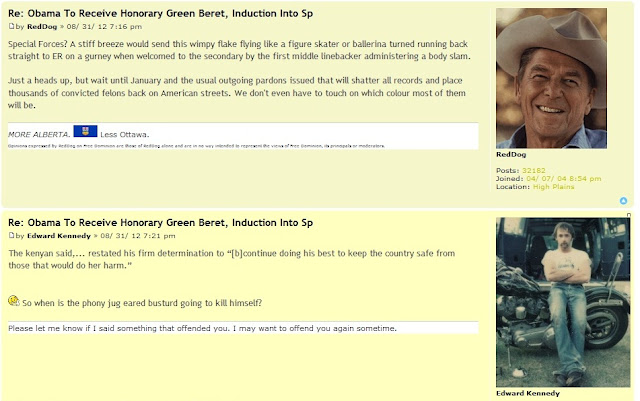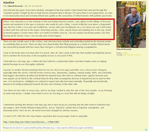 Over the last few months, it has become increasingly apparent that a number of individuals, including moderators, have grown very tired of Edward Kennedy's rantings, much of which have been virulently racist and increasingly violent (he has been most recently writing about how he could sympathize with men who murdered their wives during divorce proceedings). A tiny sample of recent examples: