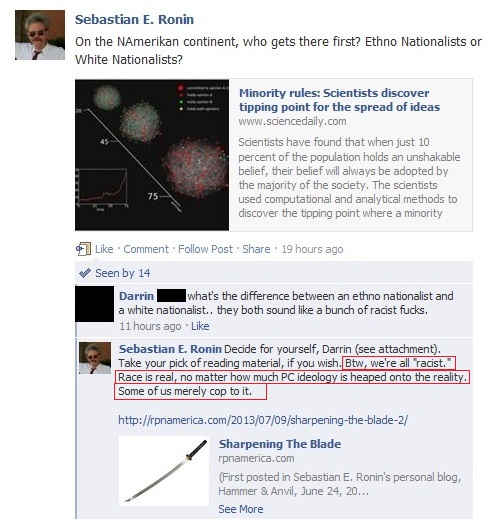 But Ronin rejects the label, "White Nationalist." Instead, he refers to himself and the ideology of the  Renaissance Part of North America as an Ethno Nationalist.