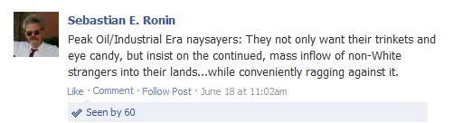 In a nutshell, Ronin suggests that when the world peak oil occurs resulting in an industrial and social decline. The crisis will then result in a collapse of existing nation states paving the way for the creation of ethnically homogenous enclaves: