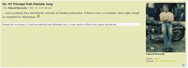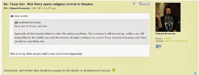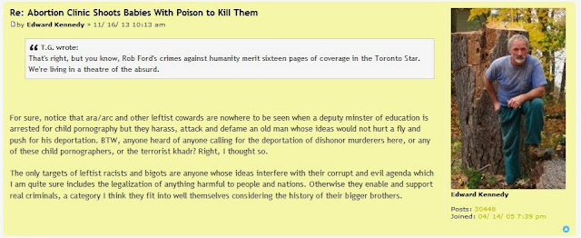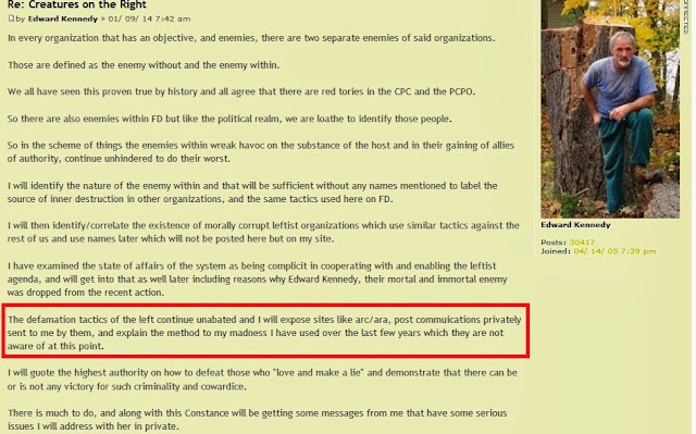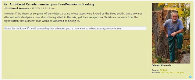 Back in March 2013 we noted that after attacking yet another fellow Free Dominion posted and precipitating yet another flame war, Edward Kennedy had been banned from Free Dominion. We had speculated that the ban may very well be temporary; our speculation was soon confirmed by Ms. Fournier: