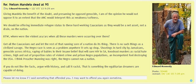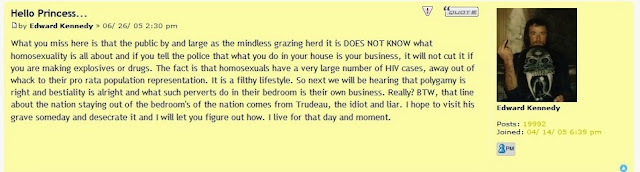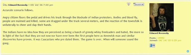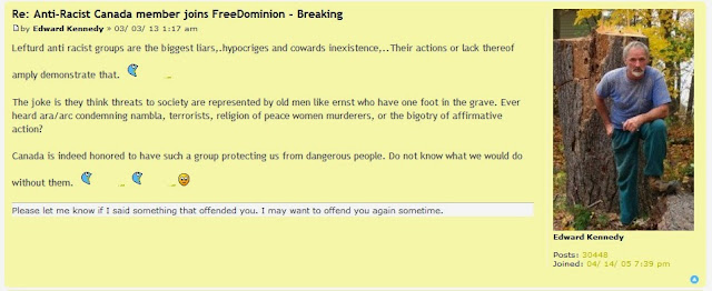Prior to this email Kennedy had not, to our knowledge, made any effort to communicate with us. Nor did we make any effort to communicate with him. However he does suggest here, as he had in numerous posts on Free Dominion, that we had committed libel by posting on our blog screen shots of what he posted on Free Dominion. Of course this begs the question as to how we could libel him by taking direct screen shots from Free Dominion and publishing them here? Kennedy proposes that the libel is as a result of not providing the proper context for the words and ideas he has posted. To that claim we respond with a question of our own.