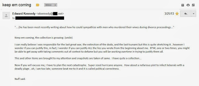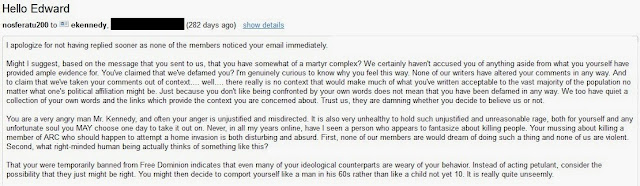 The same day we posted the blog entry regarding Kennedy being banned (as it turned out temporarily) by a Free Dominion moderator, Kennedy responded to us directly: