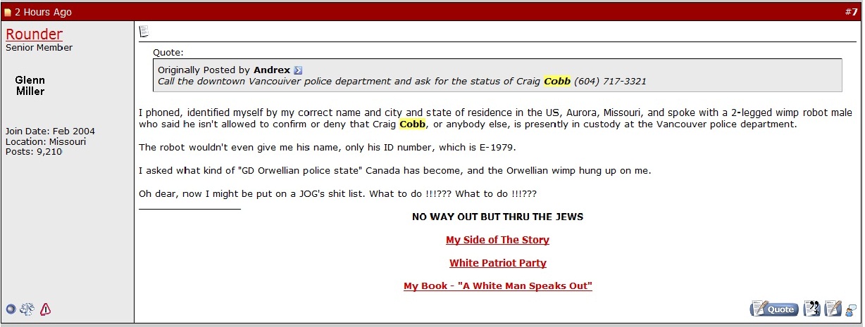 Miller was also the first whom we know of who announced that Cobb had fled Canada after the latter was arrested and charged under Sec. 319 of the country's hate crime laws.
