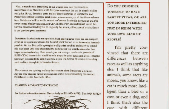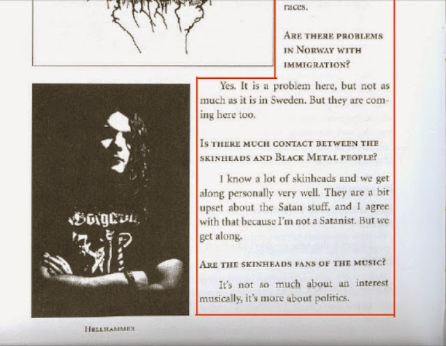 In the book “Lords of Chaos”, Hellhammer is quoted in an interview saying,“I'll put it this way, we don't like black people here. Black metal is for white people.... I'm pretty convinced that there are differences between races as well as everything else. I think that like animals, some races are more ... you know, like a cat is much more intelligent than a bird or a cow, or even a dog, and I think that's also the case with different races." races as well as everything else. I think that like animals, some races are more ... you know, like a cat is much more intelligent than a bird or a cow, or even a dog, and I think that's also the case with different races." We’ve attached pages of this book for context.