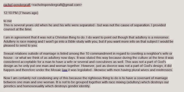 Rachel Pendergraft, daughter of Tom Robb, suggests that it isn't really adultery because Paulie was separated from his partner at the time and that the only real adultery is "race mixing." So even though it wasn't a good thing, Paulie running around on his wife wasn't all THAT bad. At least he wasn't messing around with one of those "non-white" women.