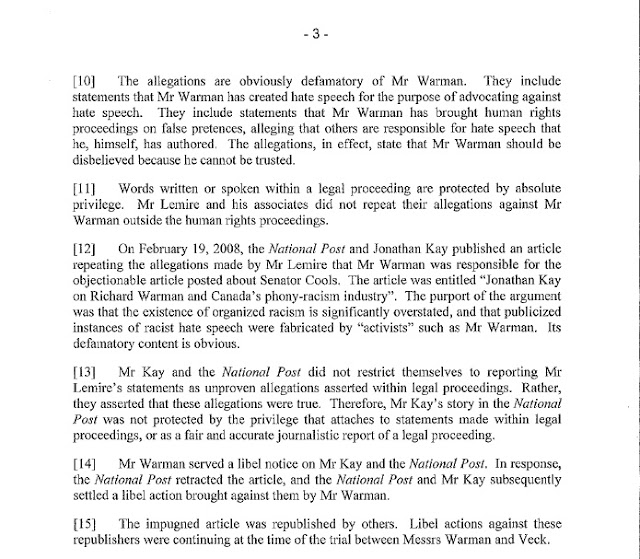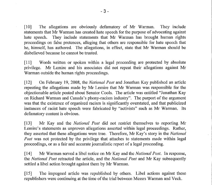 In other good news, Mr. Richard Warman was successful in yet another libel suit related to the Anne Cools smear made against him. In this case, it was against a former Conservative Party of Canada staffer: