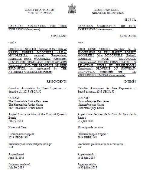 At the beginning of July, the New Brunswick Court of Appeals reserved judgement in the case of Robert McCorkill, who's will leaving his estate to the American-based hate group the National Alliance was challenged by his estranged sister, the Centre for Israel and Jewish Affairs, and the government of New Brunswick. Paulie suggested that, "experienced court observers predicted a six month wait for the decision."