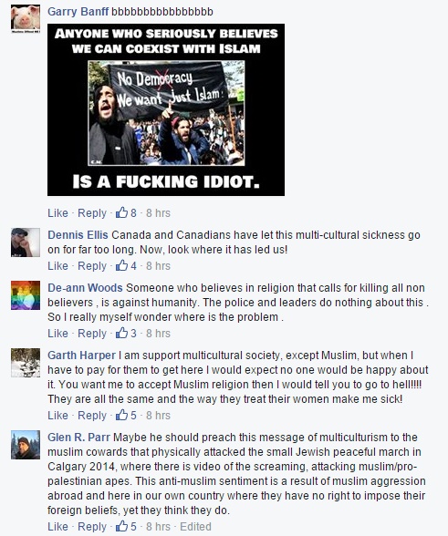 Inevitably, the rhetoric will result in some expressing their aggrievement in ways other than on written or verbal such as in the case of the pepper spraying of Syrian refugees or, as occurred in Calgary, violently anti-Muslim and refugee graffiti. The criminal behavior will then simultaneously be justified, celebrated, dismissed as a "false flag," or blamed on the group being victimized themselves: