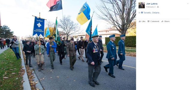 There is this too, along with Chris Alexander (CPC) and Marijka Stadnyk (Ukrainian Canadian Congress) deflecting questions about this group at one of their fundraisers. Petro Shkilnyk, the spokesperson in the video, was also in the parade (he's the RS goon with the grey cap at the point of their march.)