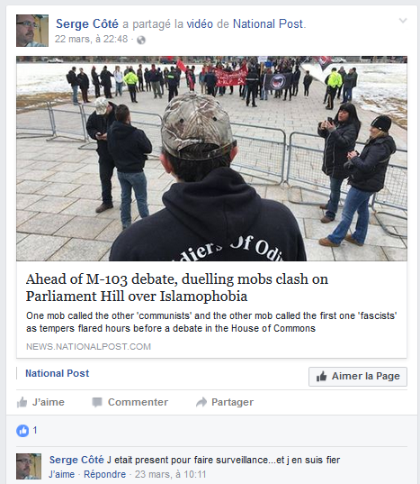 In this last picture, it seems SoO are trying to recruit from within La Meute's prospective membership. La Meute is another far-right group originally from Québec City, and they made a no-show in Gatineau on March 4th, to the frustration of their handful of supporters there. The original comment on the picture is in reference to antifas: