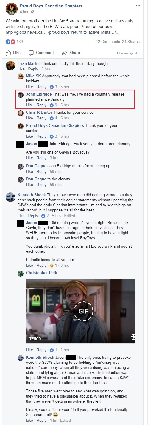 The article also mentions that one of the five is no longer in the military. In the Proud Boy Canada celebratory post on Facebook, that member briefly addresses the reason for his departure: