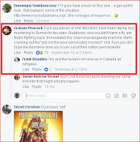 I emailed the Mayor and all of the Councillors with a sample of the information I've gathered about Pegida and Vandermaas. I sent them racist quotes from Vandermaas' articles on Medium, both against Muslims and against Natives in an article he wrote about his "heroic" interference in the Caledonia standoff. I also sent them screenshots of Pegida's reactions to the Rohingya genocide. Vandermaas is claiming he's not a member of Pegida, so I sent them a pic of him participating in the Aug 27 rally waving an Israeli flag and standing directly behind Pegida's banner. (The screenshot includes two Pegida