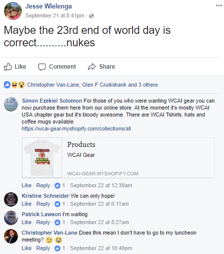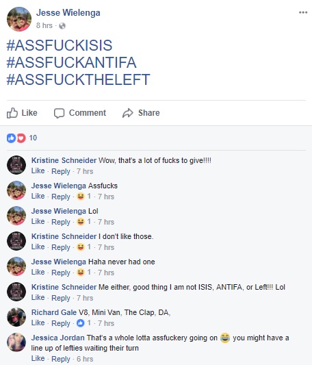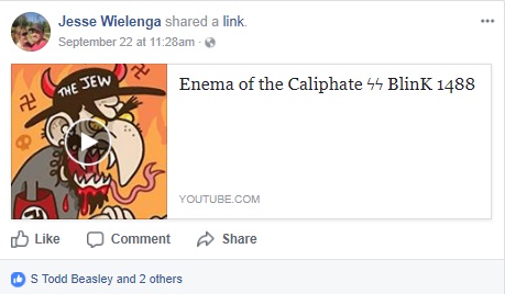 I'll finish this with is a sample of posts made by Wielenga over the course of less than a month. In these posts he expresses antisemitic, homophobic, and racist views as well as commenting on events such as NFL players taking a knee during the American anthem, the Trudeau government, the terrorist attack in Edmonton, and the shooting in Las Vegas which he (and others) have attributed to "antifa" (and a myriad of other conspiracy theories, of course). He also talks about strategy, or at least what Wielenga considers strategy, moving on while making cryptic comments regarding targeting ideological opponents: