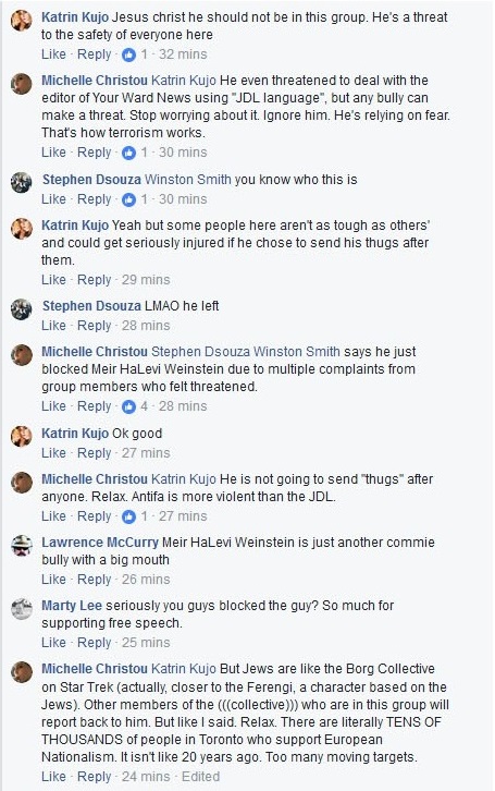 It seems that Evan Balgord was the first to cover this story in detail. He also managed to identify the two individuals listed in this article. As a result the folks on Jesse Sanderson's Students For Free Discourse Facebook group are both angry at Balgord for helping to out them and enthusiastic about the campaign itself. However when Meir Weinstein of the Jewish Defence League commented on the overt antisemitism being posted, in the thread, things get rather interesting: