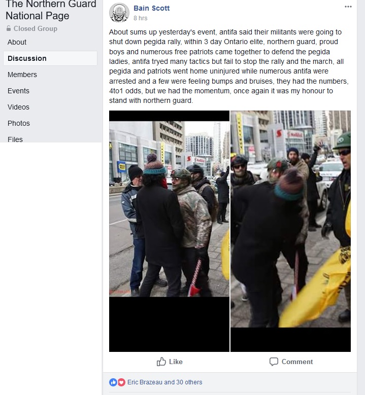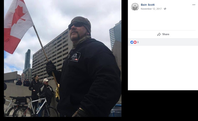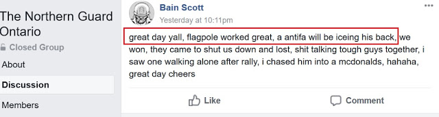 Shawn McBeath has posted as "Shawn Isgone" and "Bain Scott." He has been a member of the Soldiers of Odin, the III%ers, and has links to groups such as the JDL. He's also one of the more overtly violent members of these groups bragging about carrying weapons and assaulting counter-protesters: