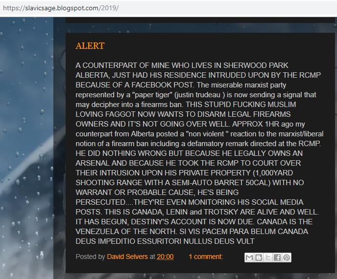 The Canadian Anti-Hate Network wrote about him and his racist blog (an example of one article is included above) in a great deal of detail as well as his connection to the Yellow Vest convoy traveling to Ottawa: