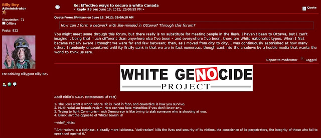 As the case went on, we learned more about the situation your two children found themselves in. We learned of an unkept, often filthy apartment. We learned that your daughter often wouldn't attend school because mommy and daddy wanted to sleep in and didn't want to be bothered getting her ready for class. We learned that, some time before, you and your ex up and left your children in the care of relatives while you both moved to Brandon to start try and start a racist group (we've been aware of you and your husband for years, even before the Infantry 14 efforts). We learned about alcohol and drug abuse. We heard about neglect. We heard about a little girl who learned from her mother and step father that people of color should be killed. We learned about credit card fraud and we learned about a DUI during the custody case. We learned that the mother, for whatever reason, decided to move to Quebec and attend custody hearing infrequently.