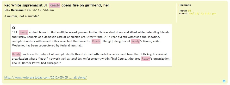 The individual who posted this link accused us of covering up the murder of the, "heroic" JT Ready who died defending himself and his family whom he dearly loved.